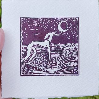 “Night Sky” is a captivating reduction greyhound linocut print that beautifully captures the essence of a greyhound’s grace against a serene nocturnal backdrop. This limited edition artwork, with only 11 unique prints available, showcases the intricate reduction linocut technique.